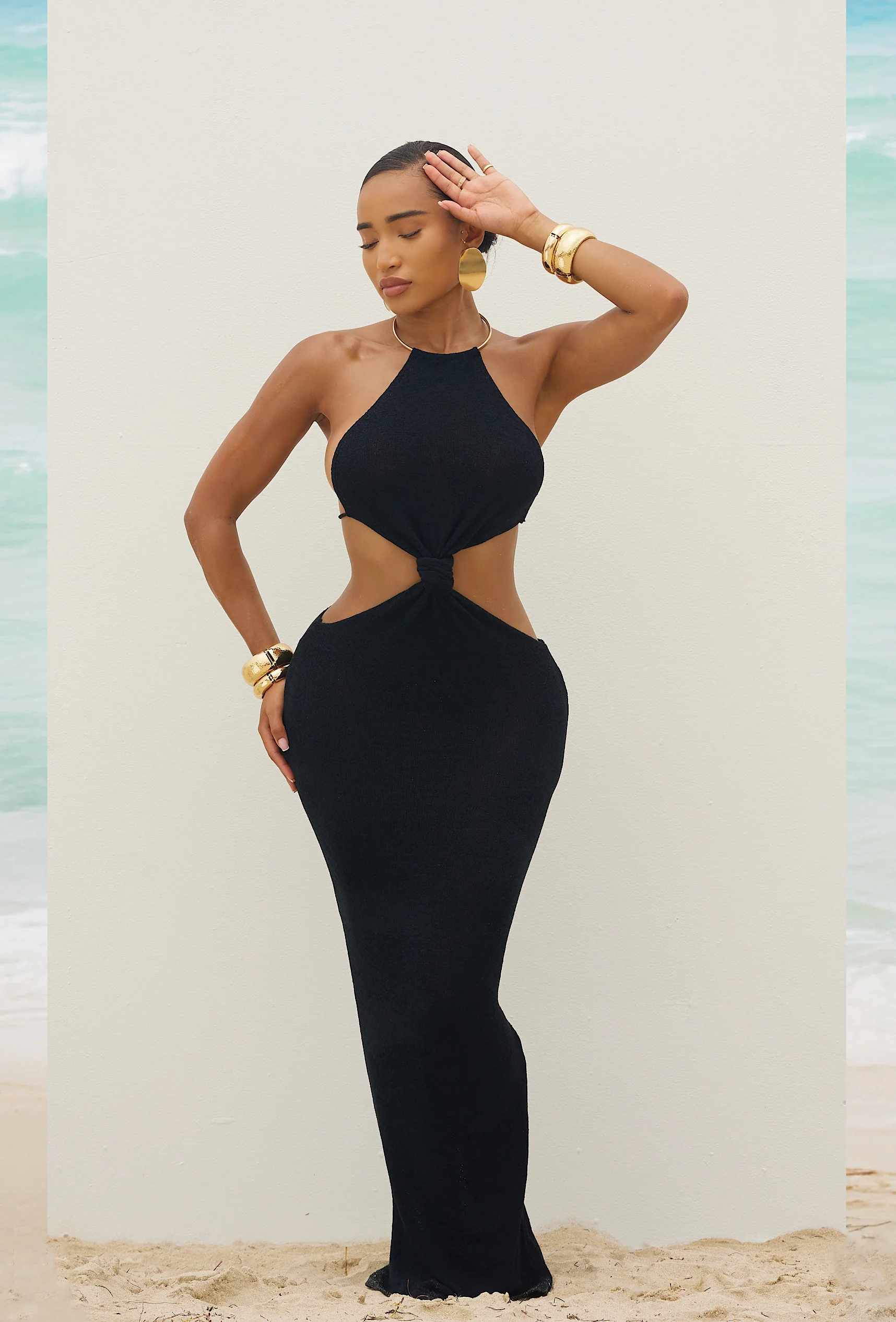 Introducing the Matte Resort Amara Dress - Onyx, a versatile and stylish choice for your SS24 wardrobe. Featuring a chic gold choker detail and lightweight knit fabric, this dress is ideal for both date nights and evenings out.
